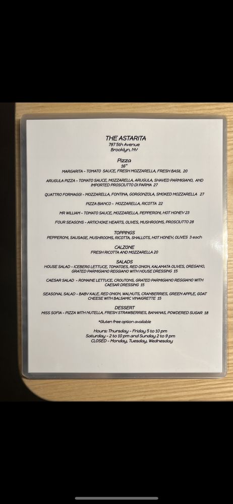 “ If the thought of a thin crust pepperoni pizza drizzled with hot honey hasn't crossed your mind before you opened up this app, prepare to have your world ROCKED. The Mr. William is as sinfully delicious as it sounds, and I'm not ashamed to say that after first trying it while sharing with friends, I have since returned to order full ones that I enjoy over the course of multiple days because I must exert SOME control. That said, The Asterita has so much more deliciousness on the menu. The meatballs are scrumptious and MASSIVE. Even the salad is excellent. And it's a gem of a spot - intimate in size - with charming decor and staff. The menu, like the space, is small but hella effective in its mission to provide satisfyingly good eats in a chill environment where you can chat and chew at a decent volume (although you may get a little loud from the excitement of your first bites). Enjoy! ”